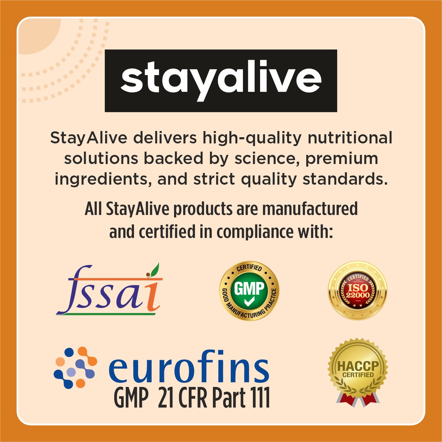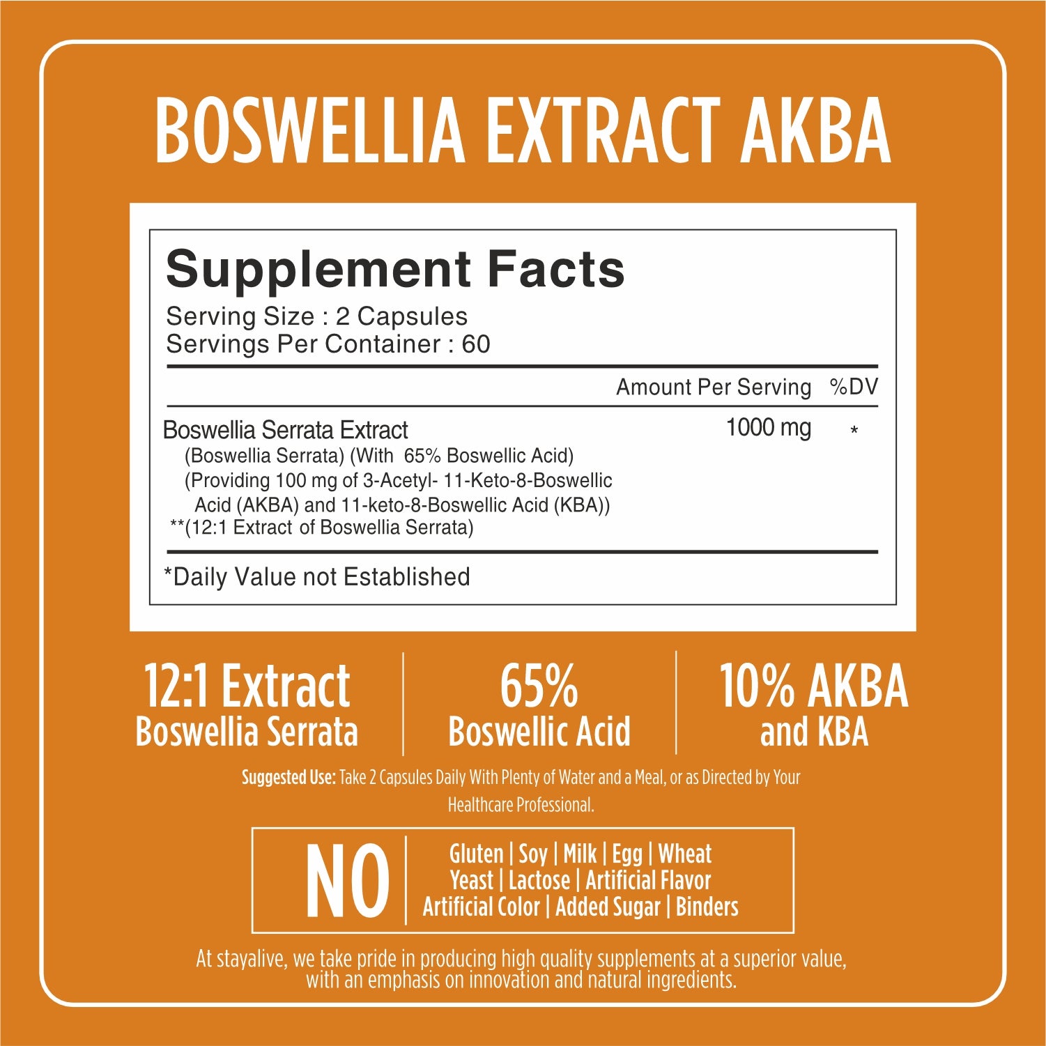 Experience the ancient wisdom of wellness with StayAlive Boswellia Extract Capsules AKBA, enriched with 65% Boswellic Acid. Each capsule offers a powerful 1000mg of Boswellia Extract, a renowned resin praised for its remarkable anti-inflammatory properties and joint support. Embrace this age-old secret for joint comfort, immune boost, and inflammation control, and move through your day with ease and vitality.