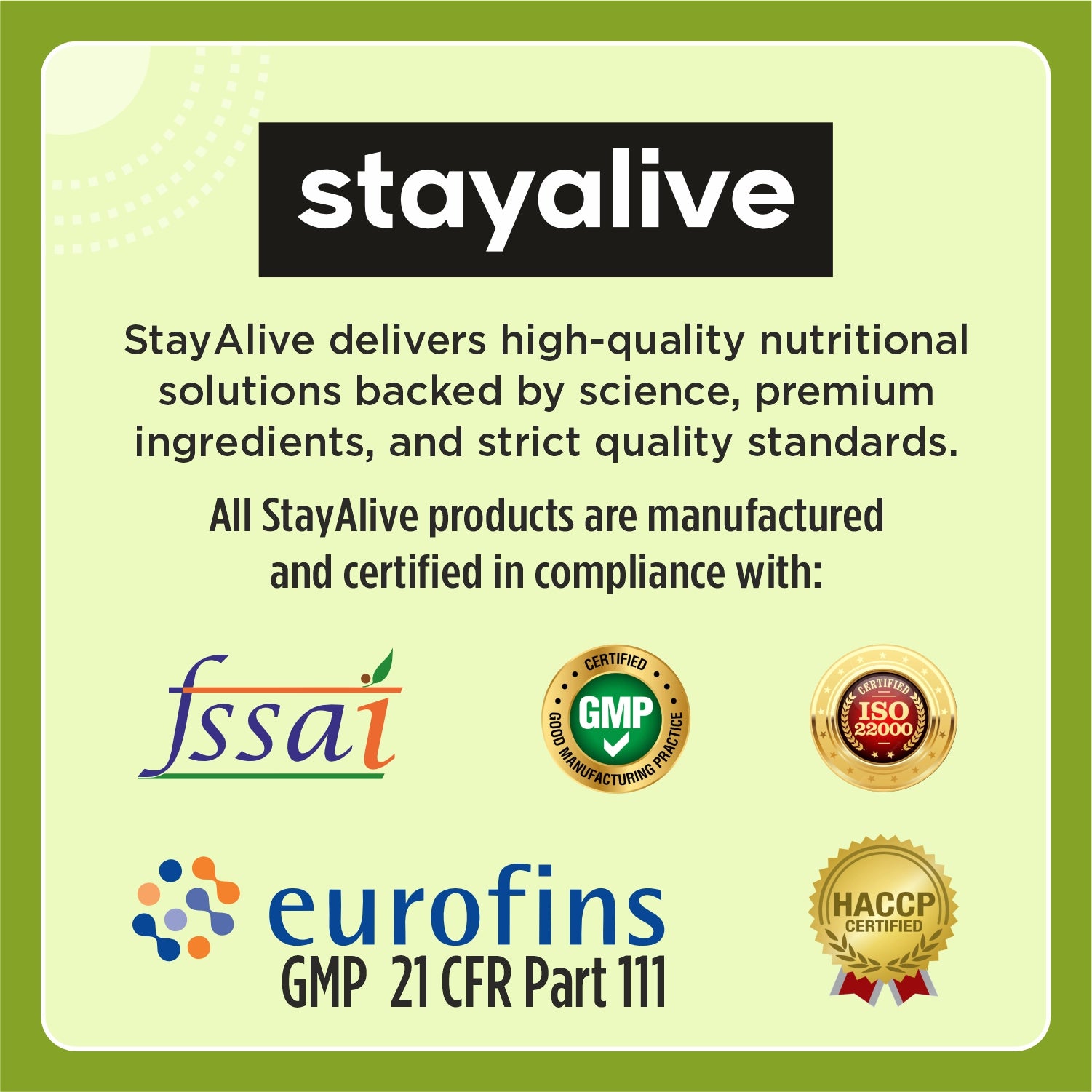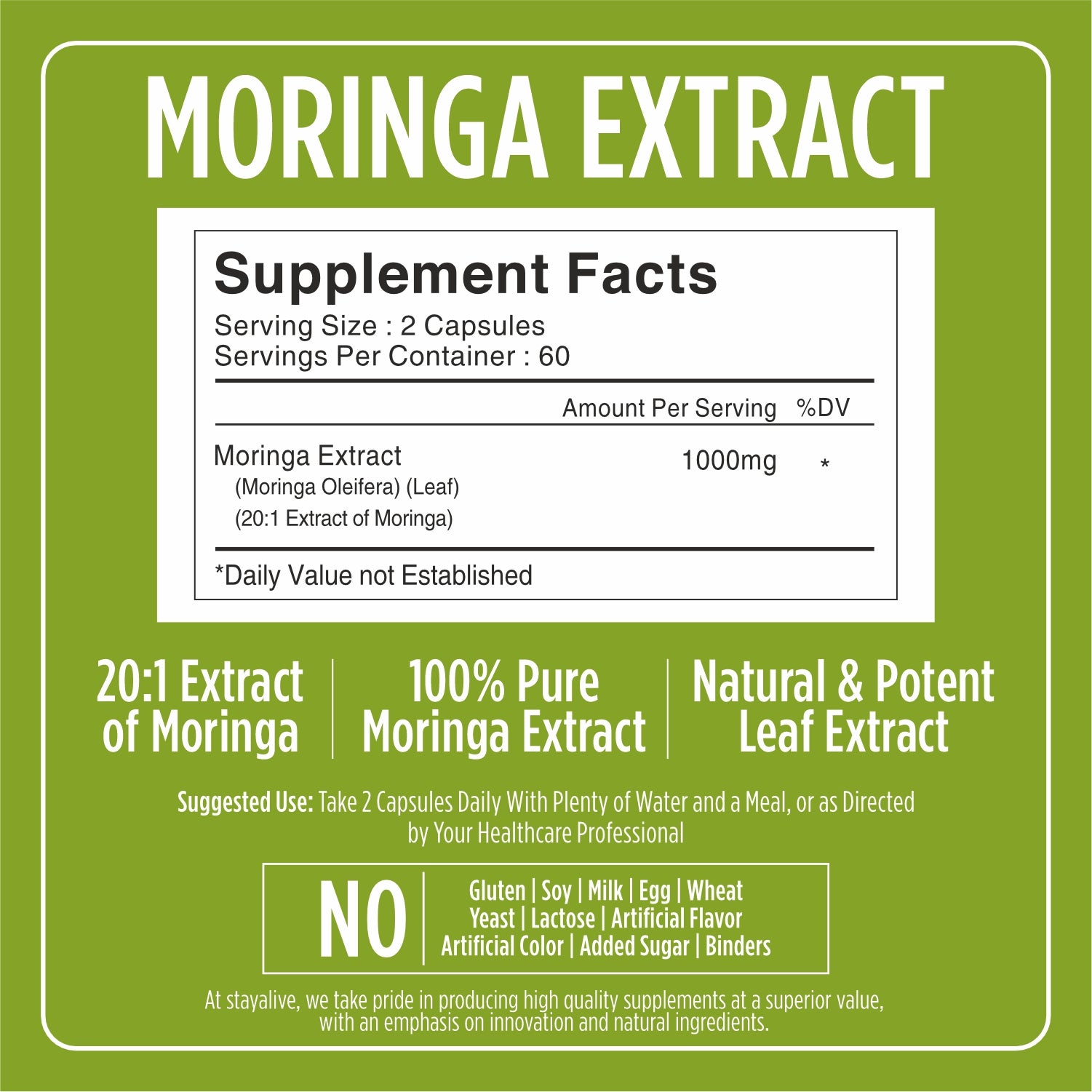 Experience the power of nature's superfood with StayAlive Moringa Extract Capsule packed with 1000mg Moringa extract per serving. This moringa oleifera capsule delivers phytonutrients, multivitamins, and green goodness that fuels your day naturally.