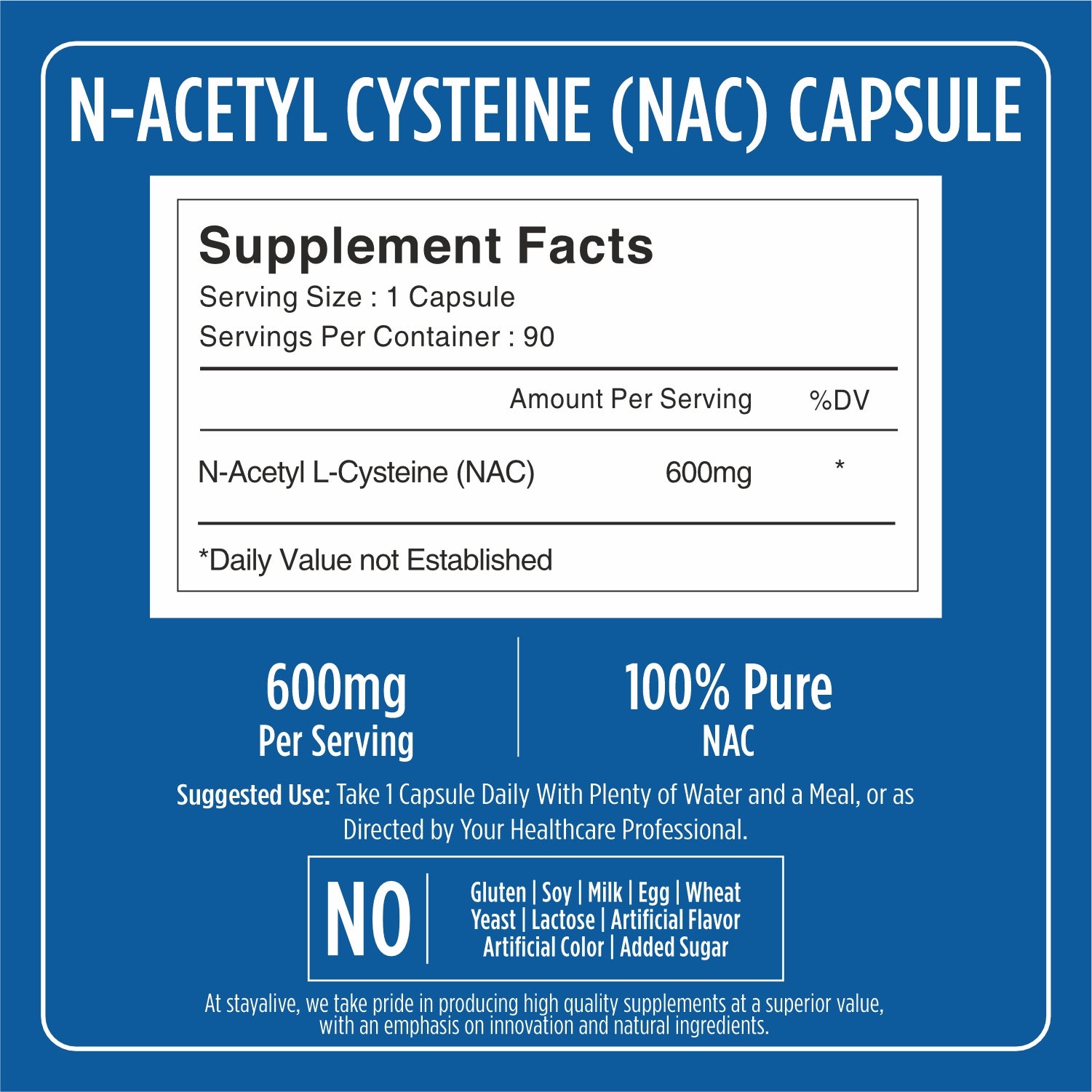 StayAlive N-Acetyl L-Cysteine (NAC) Capsules deliver a high-potency dose of 600mg per serving to provide advanced antioxidant support and liver detox. As a precursor to glutathione, this pure NAC supplement helps neutralize free radicals and promotes respiratory health. Expertly formulated for cellular protection and immune system support, these capsules offer a clinically-backed solution for metabolic wellness and overall vitality.