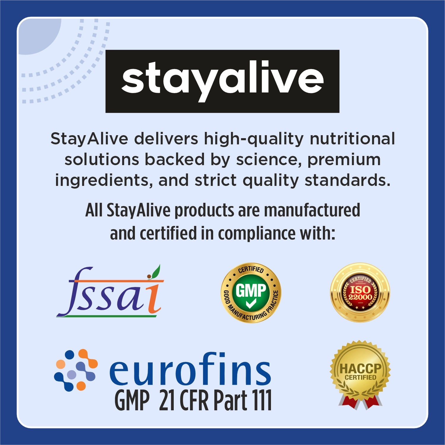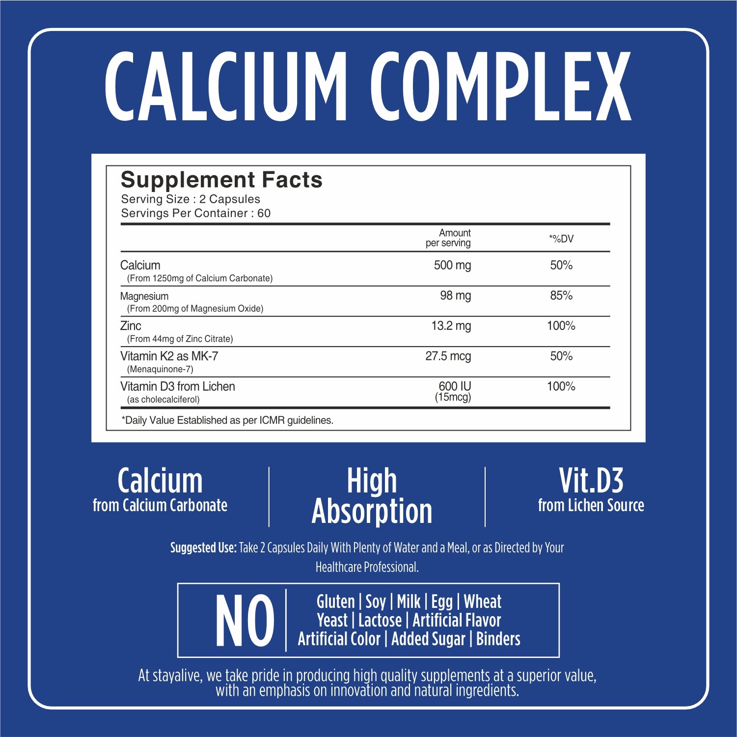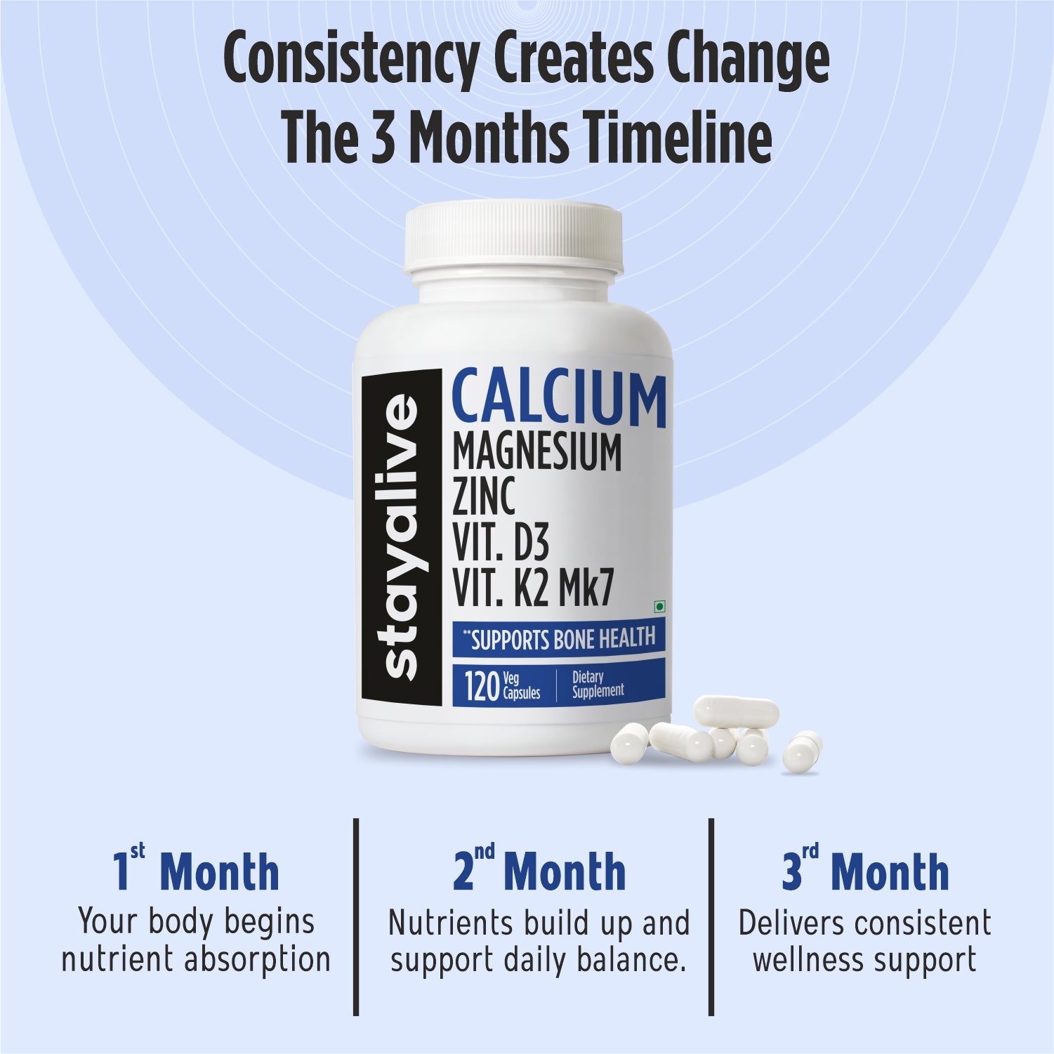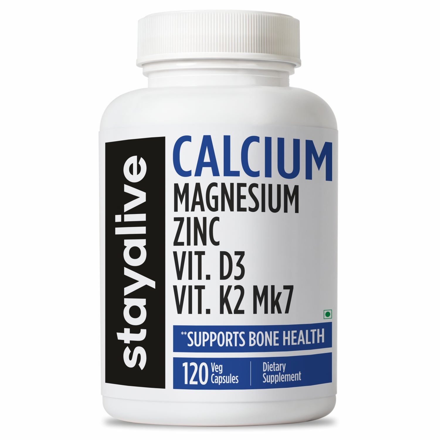 StayAlive Calcium Magnesium Capsules provide a comprehensive blend of essential nutrients to support bone, joint, and muscle health. Each serving delivers Calcium, Magnesium, Zinc, Vitamin K2 (MK-7), and Vitamin D3 from Lichen to support strong bones, muscle function, and overall skeletal health.