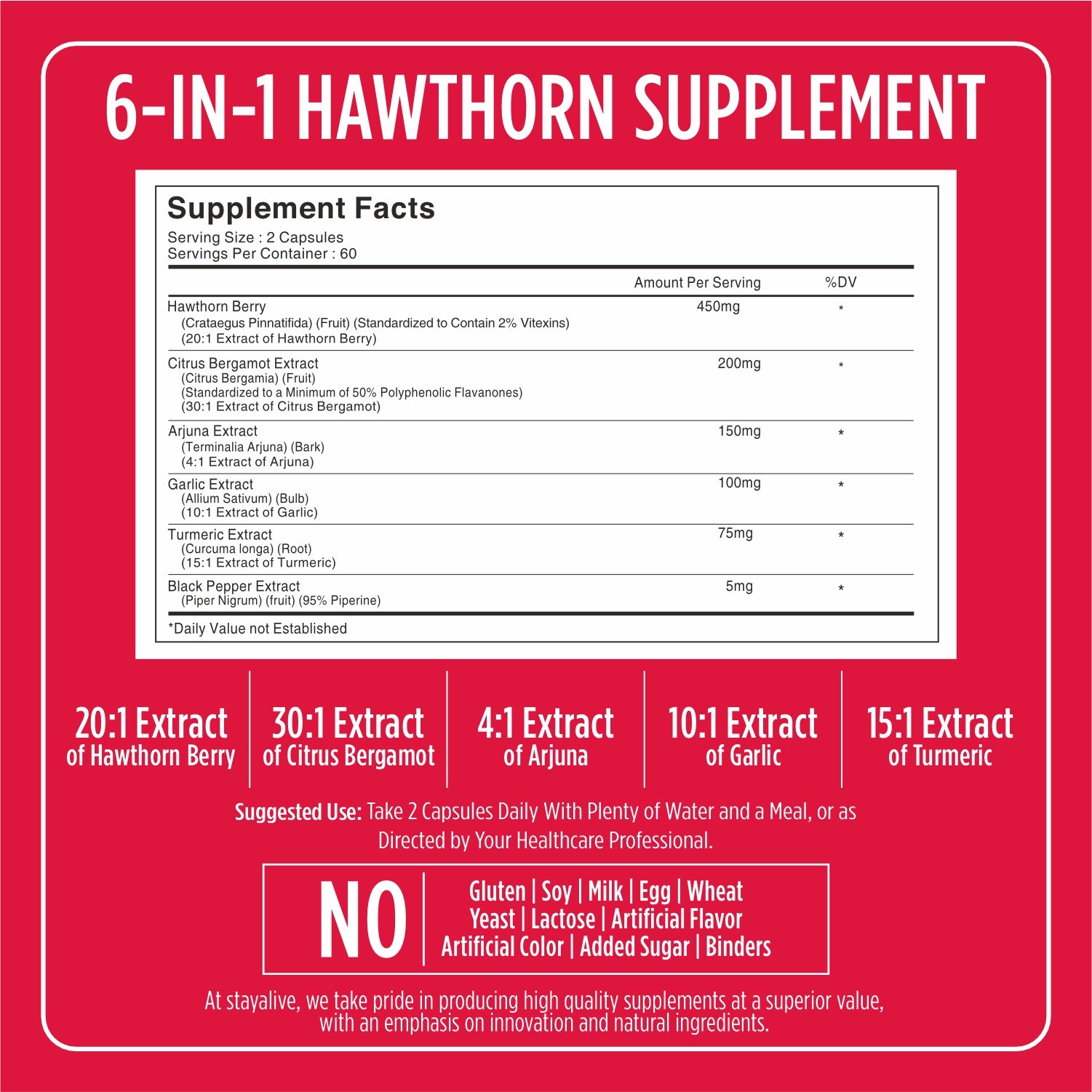 Discover the heart-healthy benefits of StayAlive Hawthorn Extract Capsules. Each capsule delivers a potent 450mg of Hawthorn Berry Extract, standardized to contain 2% Vitexins. Renowned for its traditional use in promoting cardiovascular health, Hawthorn offers a natural way to support blood circulation, maintain healthy blood pressure levels, and manage cholesterol. Embrace the strength of Hawthorn and pave the way to a heart-healthy lifestyle.
