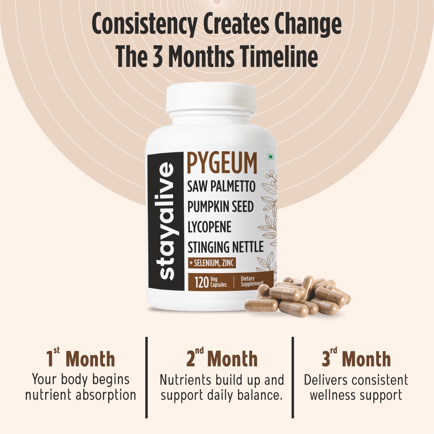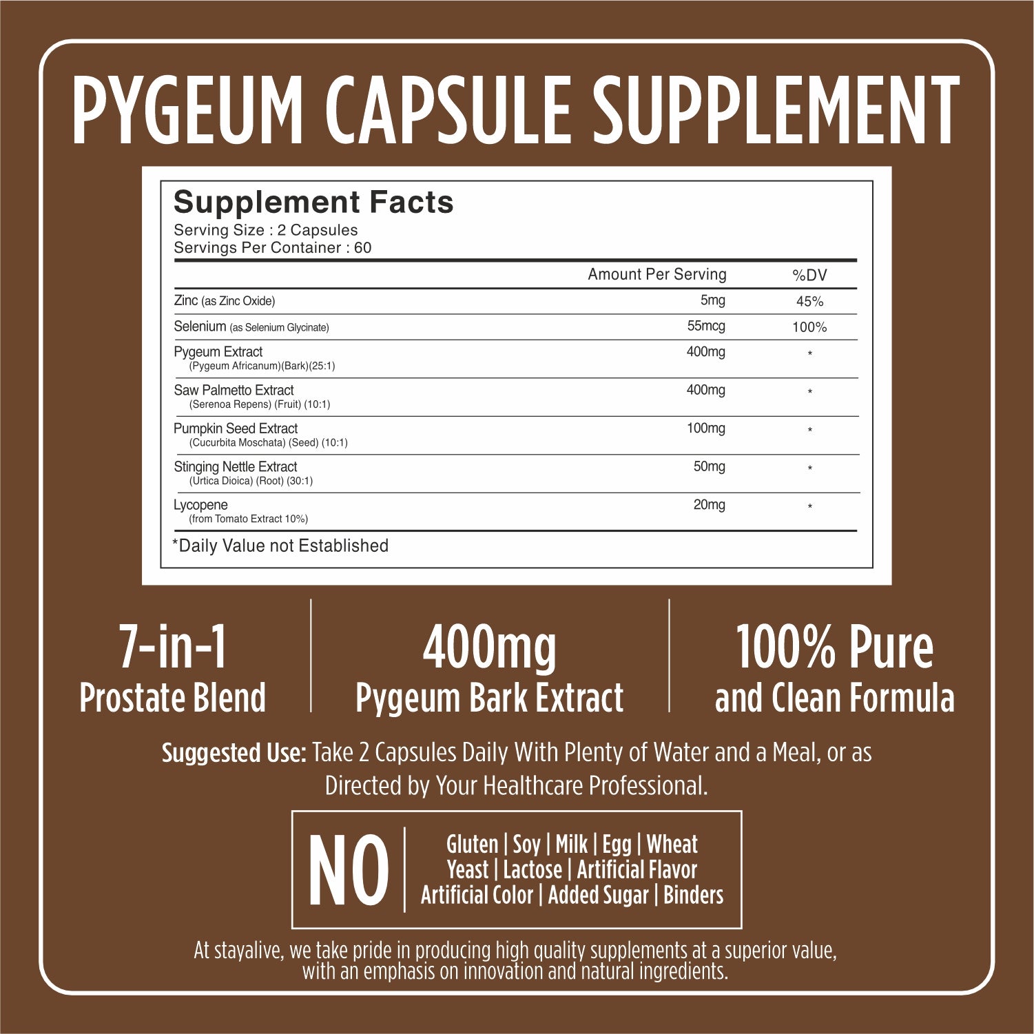 StayAlive Pygeum Africanum Capsules are a premium 7-in-1 Prostate Blend specifically designed for comprehensive men's health. Each serving provides a potent 400mg of 25:1 Pygeum Bark extract and 400mg of Saw Palmetto to support healthy prostate function and optimal urinary tract health. This high-potency formula is enriched with Pumpkin Seed, Stinging Nettle, Lycopene, Zinc, and Selenium to provide advanced antioxidant support and bladder control. Expertly formulated for daily vitality, these pygeum capsules offer an ideal natural solution for maintaining hormonal balance and long-term wellness.