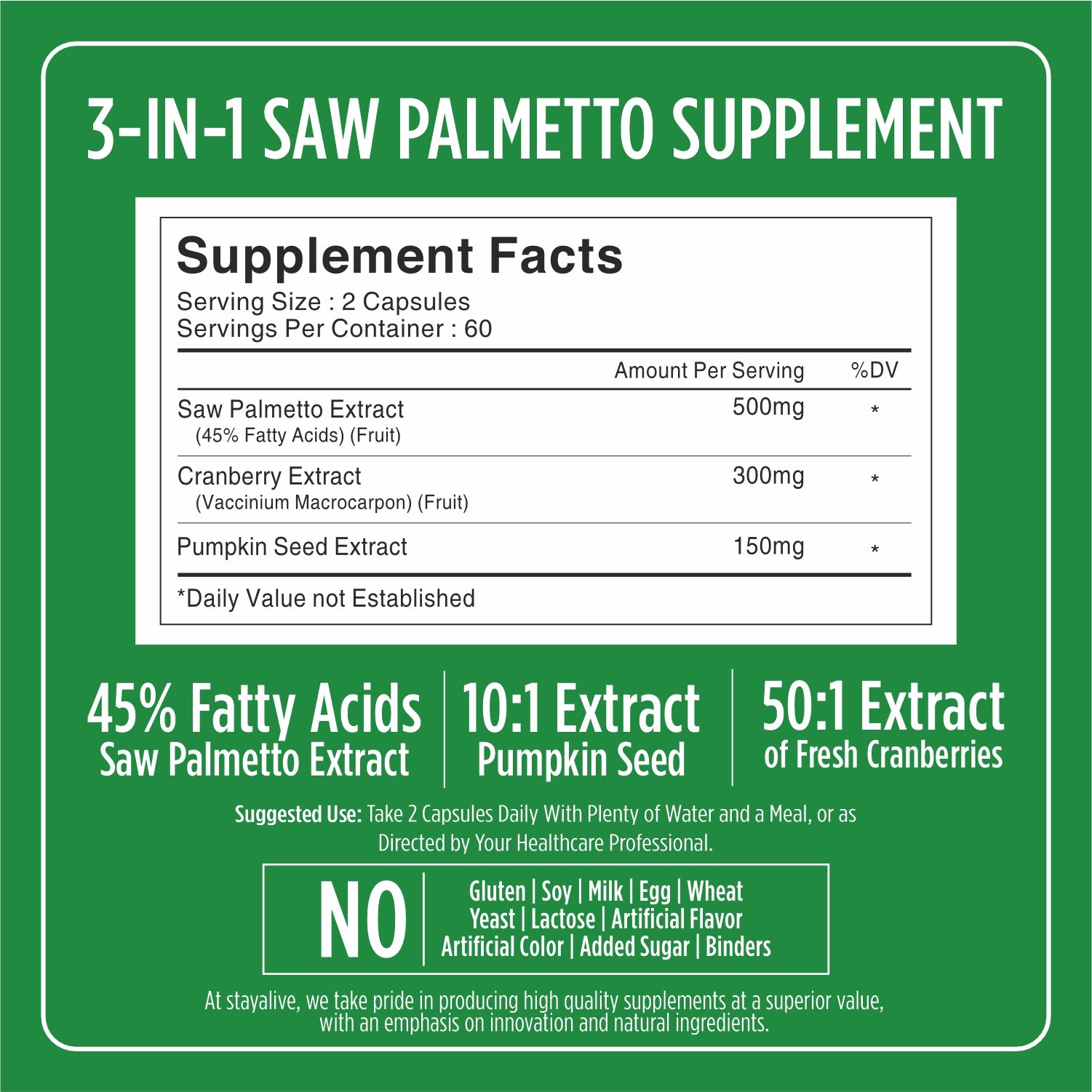 Elevate your health with StayAlive Saw Palmetto Capsules, enriched with Cranberry and Pumpkin Seed Extract. This meticulously crafted blend offers 950mg per serving and is designed to support urinary health, prostate wellness, and hair vitality. Transform your daily health regimen and embrace the comprehensive benefits offered in each capsule.