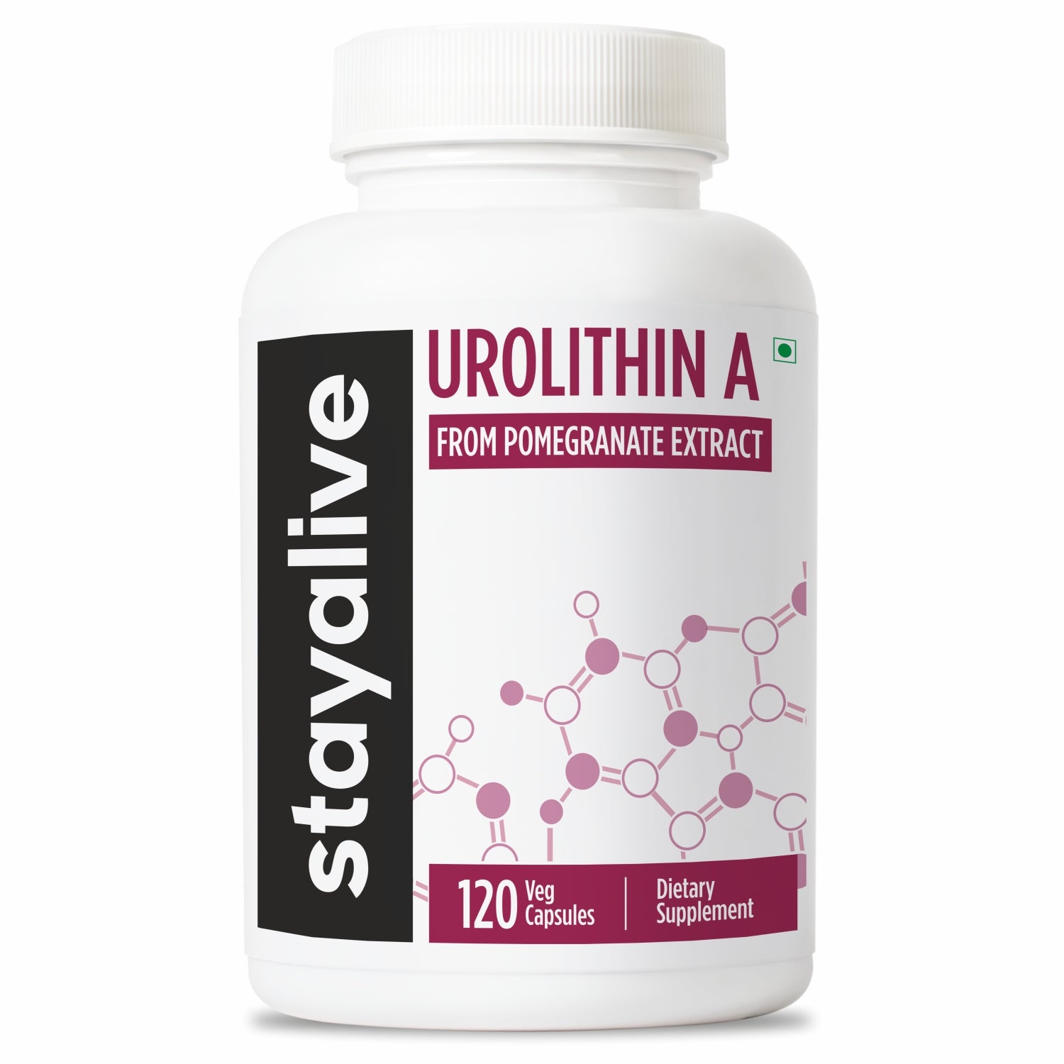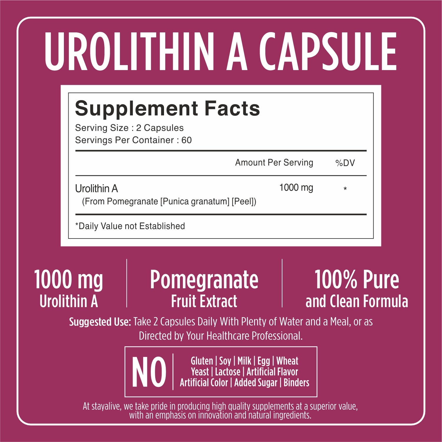 Optimize your cellular health with StayAlive Urolithin A Capsules, a premium pomegranate extract supplement designed to support mitochondrial rejuvenation. Each serving provides 1000mg of pure Urolithin A, delivering a pure & clean formula that is ethically sourced and scientifically backed. Whether you're seeking to enhance muscular endurance or overall longevity, Urolithin A supplement offers a potent, plant-based solution for total body recovery and energy.