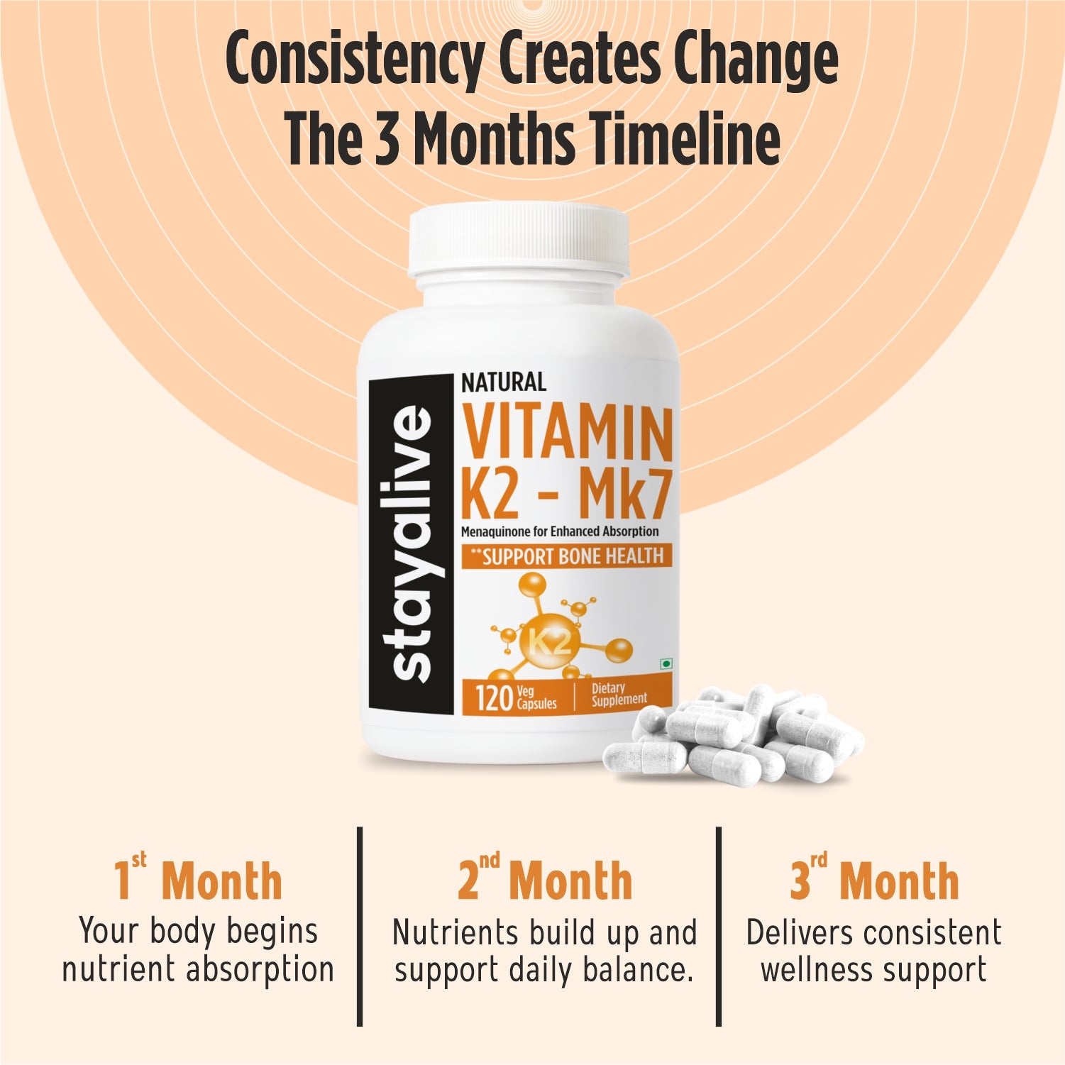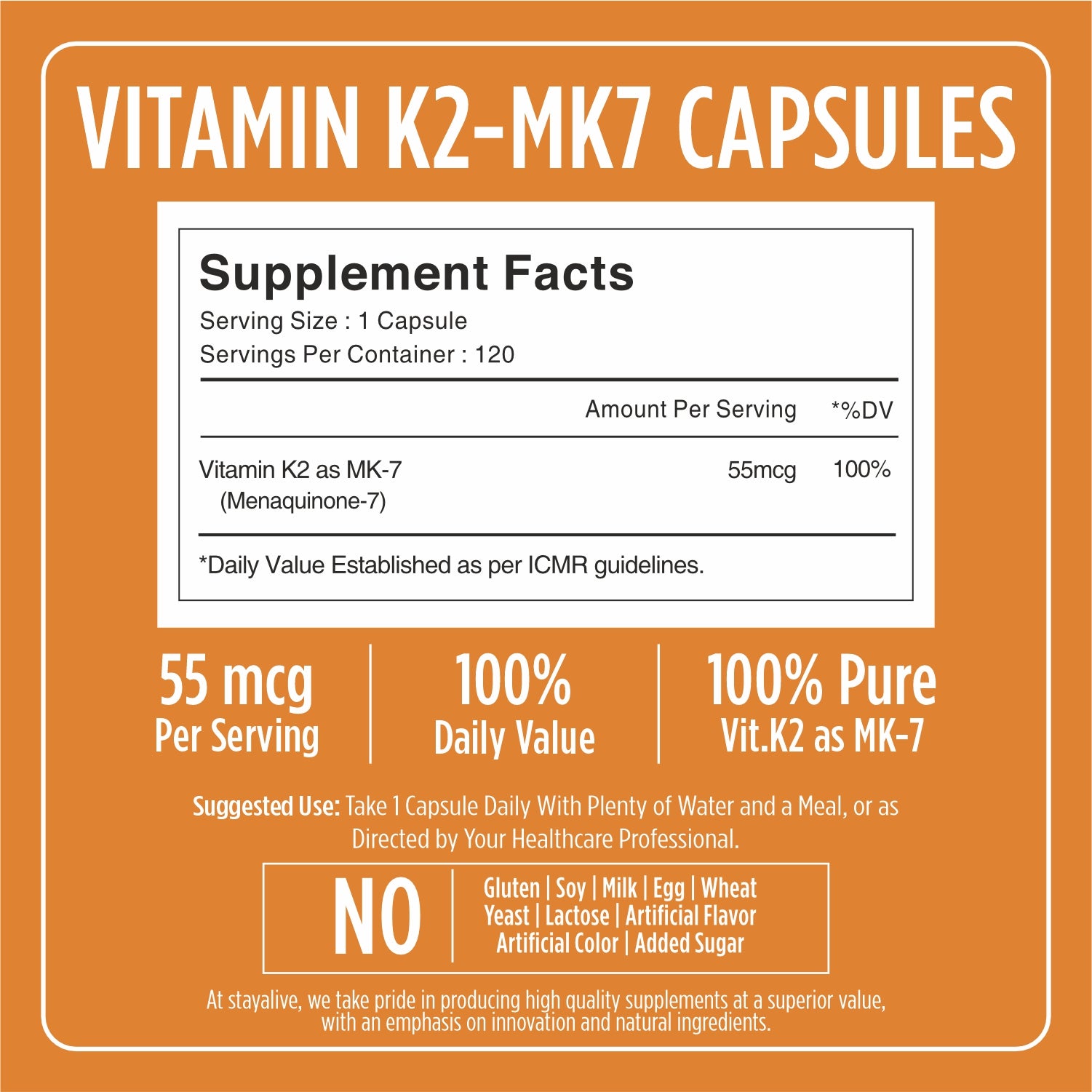 Strengthen your foundation with StayAlive Vitamin K2 MK7 Capsules, a high-potency formula designed for peak bone and heart health. Each serving delivers 55mcg of Menaquinone-7, providing 100% daily value to ensure calcium is efficiently directed to your bones rather than your arteries. Our pure and clean formula is crafted with a focus on natural ingredients and is free from gluten, soy, and artificial additives. These vitamin k2 mk7 supplements offer a premium, simple solution for long-term skeletal support and cardiovascular wellness.