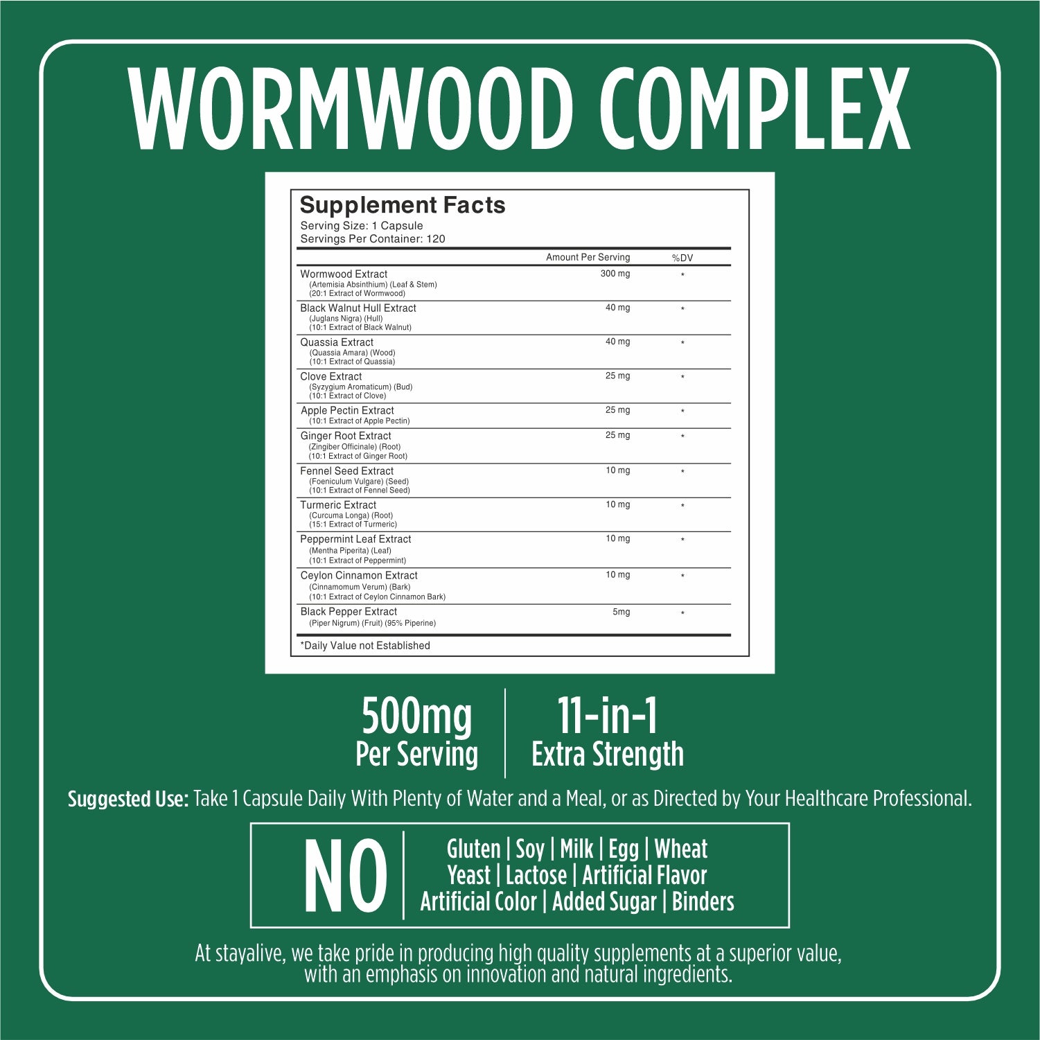 Experience the power of nature with StayAlive Wormwood Complex Capsules. Each capsule contains an advanced 11-in-1 formula, combining potent herbal extracts like wormwood, black walnut, clove, quassia, apple pectin, and turmeric. This synergistic blend is designed to support digestive health, promote gut balance, and enhance immunity. With 8005mg equivalent per serving, this extra-strength supplement is an essential addition to your daily wellness regimen.
